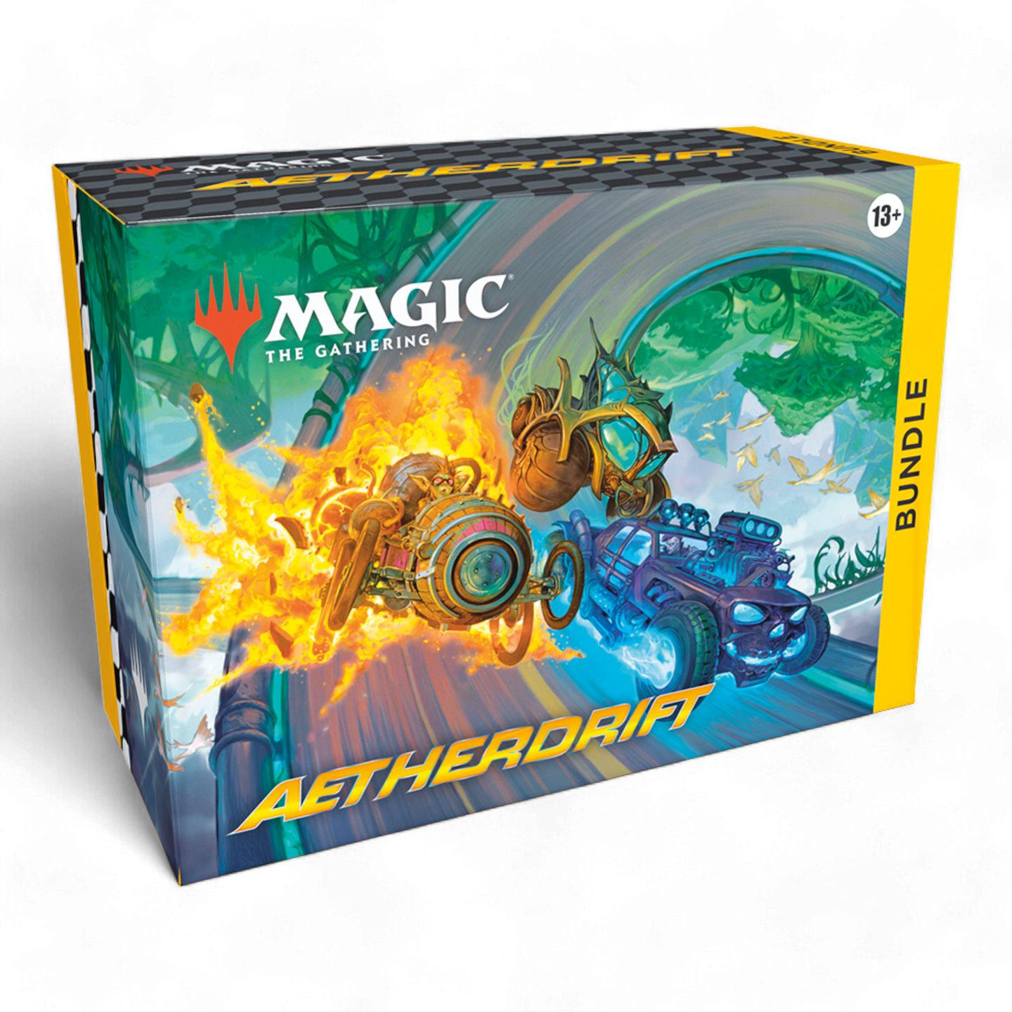 Put the pedal to the metal and feel the adrenaline with a box full of Aetherdrift cards and exclusive accessories. This Bundle contains 9 Aetherdrift Play Boosters, plus 1 Traditional Foil card with Bundle-exclusive alternate-art, 20 Traditional Foil and 20 nonfoil Land cards, 1 oversized Spindown life counter, 1 card storage box, and 2 reference cards. Each Play Booster contains 14 Magic: The Gathering cards, including 1–4 cards of rarity Rare or higher and at least 1 Traditional Foil card.