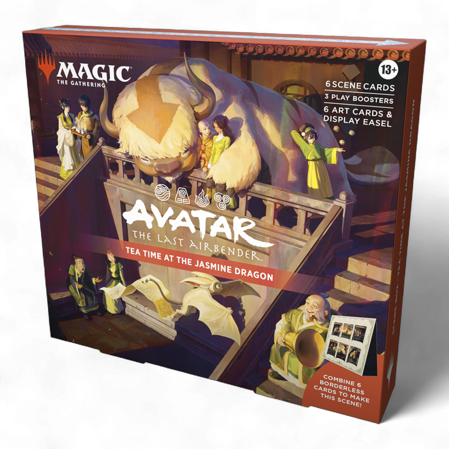 Get both Magic: The Gathering | Avatar: The Last Airbender Scene Boxes—The Black Sun Invasion and Tea Time at the Jasmine Dragon. Each Scene Box contains 6 Traditional Foil Borderless Scene Cards, 6 Art-Only Scene Cards, 3 Play Boosters, and a paper display easel. Each Play Booster contains 14 Magic: The Gathering cards, including 1–4 cards of rarity Rare or higher and 3–5 Uncommon, 6–9 Common, and 1 Land cards. One card of any rarity is Traditional Foil. The Land card is also Traditional Foil in 20% of Play Boosters.