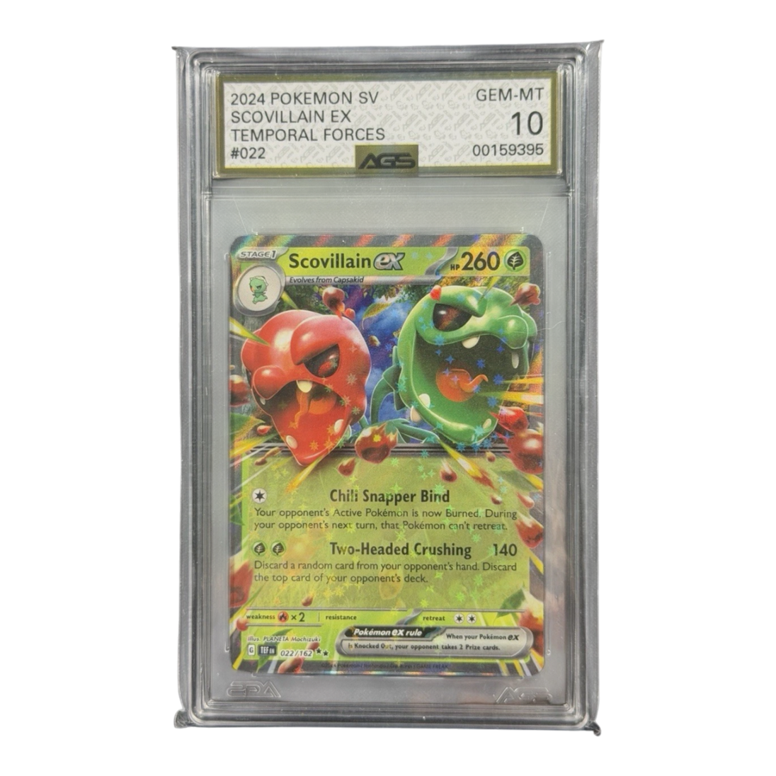 This Scovillain ex comes from Temporal Forces (2024), part of the ongoing Scarlet & Violet era that introduced vibrant holo patterns, bold full-art treatments, and refined ex-era card design. Scovillain—Pokémon’s first-ever dual-type Grass/Fire line—quickly became a fan-favorite for its unique typing and explosive artwork style.