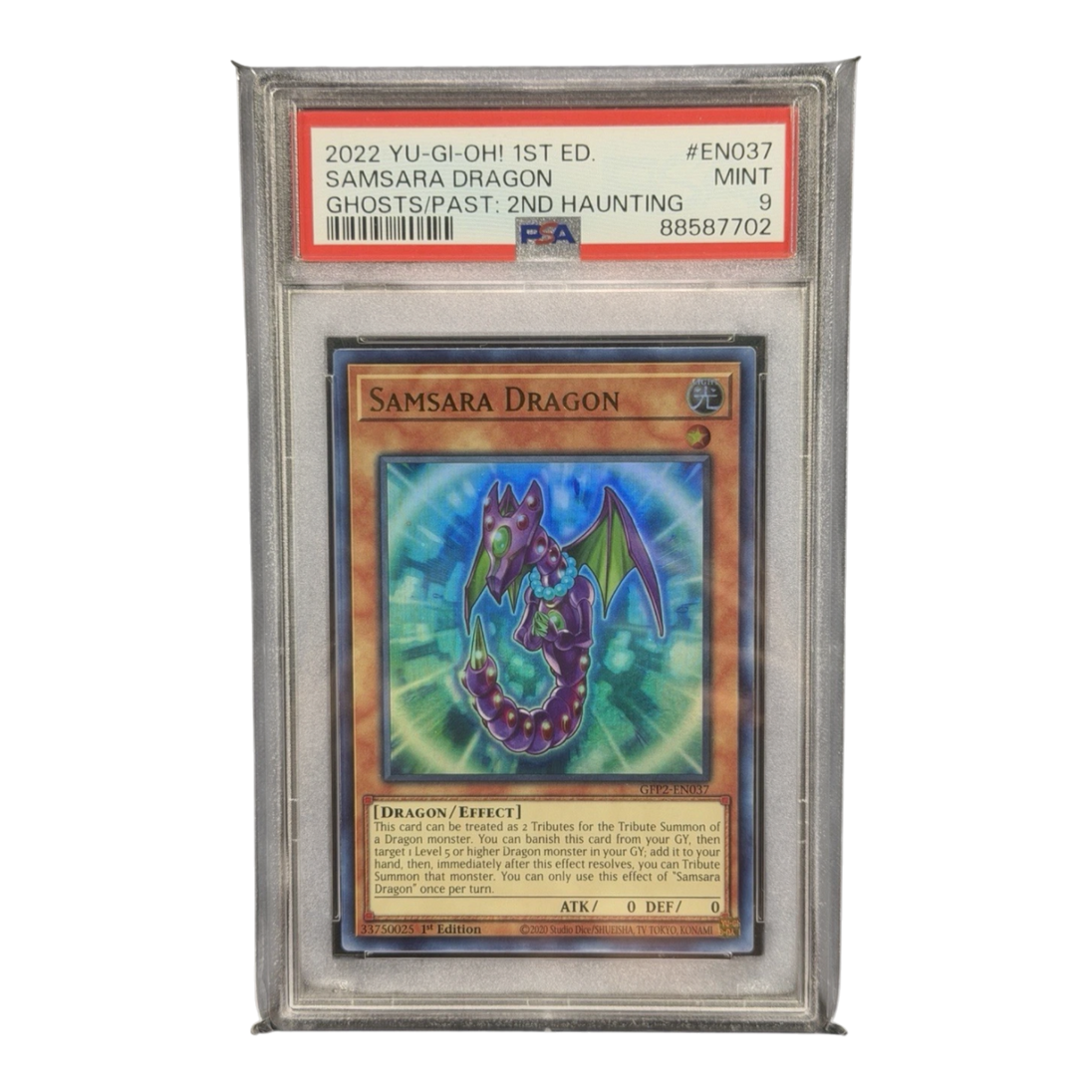 This Samsara Dragon from Ghosts From the Past: 2nd Haunting (2022) is a modern-era utility Dragon with strong Graveyard synergy. Its effect allows it to count as two Tributes for the Tribute Summon of a Dragon monster, and its banish ability helps recycle high-level Dragons from the GY — making it a flexible combo piece in Dragon-focused decks.